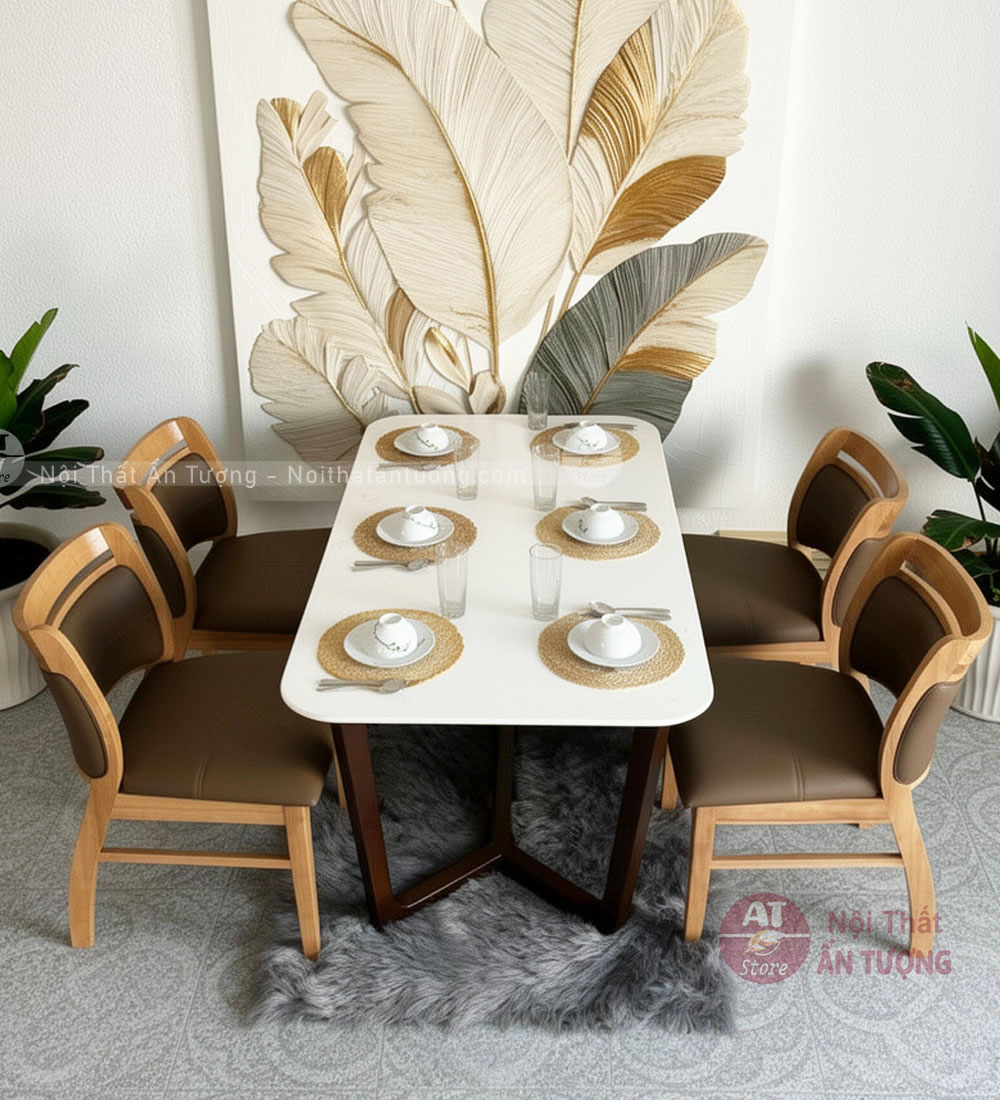 - Chất liệu: Mặt bàn: Đá Ceramic.| Khung bàn: Gỗ cao su tự nhiên sơn PU bóng mờ | Ghế: Gỗ tự nhiên + đệm bọc da PU cao cấp.
