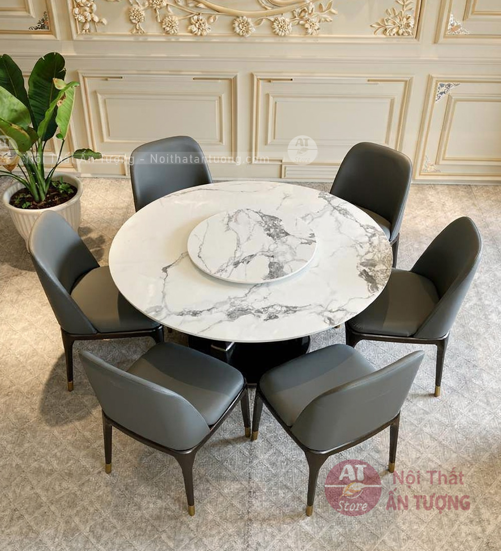 Bộ bàn ăn tròn mặt đá 6 ghế mâm xoay – Nội Thất Ấn Tượng