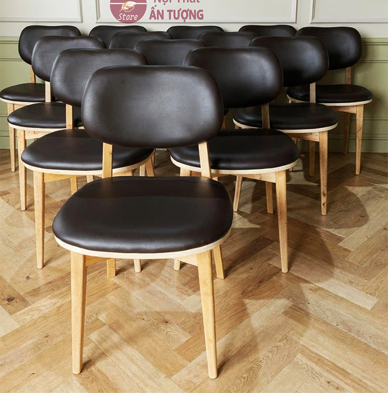 - Chất liệu: Khung ghế: Gỗ cao su tự nhiên. | Nệm ngồi & lưng: Da PU hoặc Vải nỉ ; vải nhung.