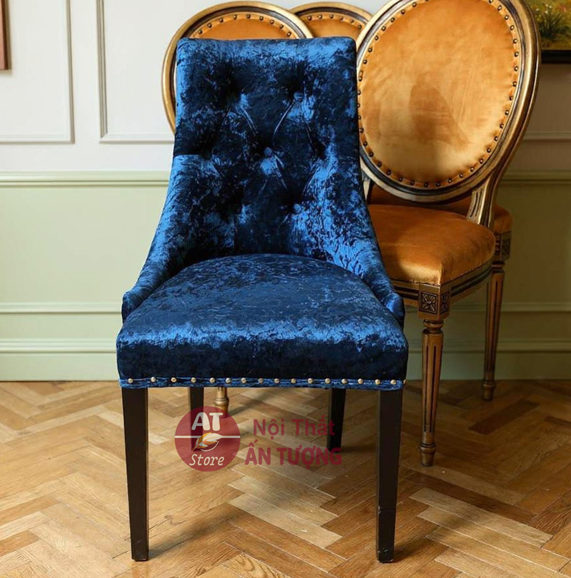 - Chất liệu: Khung ghế: Gỗ cao su tự nhiên sơn PU bóng mờ | Bọc toàn bộ: Nhung cao cấp màu xanh navy | Trang trí: Đinh đồng viền lưng & hông ghế